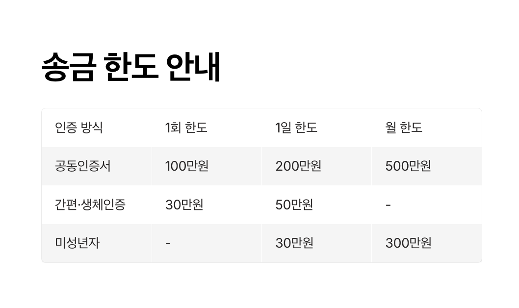 송금 시 한도(1회 최대 100만 원, 1일 최대 200만 원, 월 500만 원)를 확인하고, 인증 단계(간편 인증·공동인증서·생체 인증)에 따라 한도가 달라진다는 점을 유의하세요. 또한 기본 수수료는 무료이며, 일부 은행 즉시이체만 소액이 부과될 수 있으므로 화면 안내를 꼭 확인하시기 바랍니다.