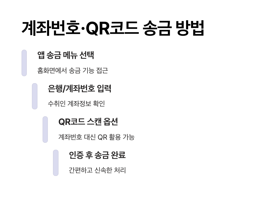 - 내 QR코드 제시: 반대로 상대방이 송금할 때는 내 QR코드를 켜고 상대방이 스캔하는 방식으로도 가능합니다.