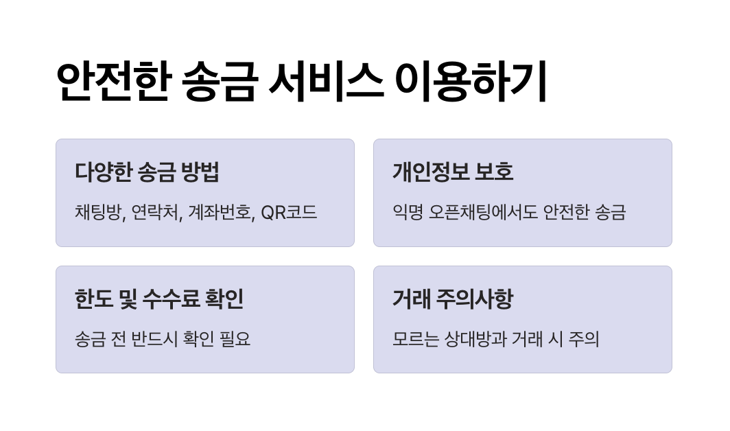 - 기본 수수료 무료: 카카오톡 채팅방 송금, 연락처/계좌번호 입력 송금, QR코드 송금 등 모든 일반 송금 기능은 수수료가 없습니다. 송금 금액 전액이 상대방에게 그대로 전달됩니다.