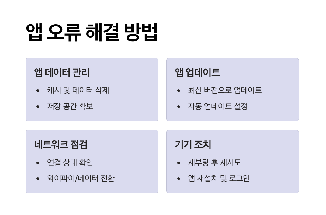 - 앱 재설치: Play 스토어 또는 앱스토어에서 ‘업데이트’가 아닌 ‘제거 후 재설치’를 진행해 손상된 파일을 복구합니다.