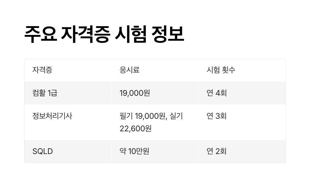 - SQLD (SQL 개발자 자격증): 데이터베이스 관련 직무 필수, SQL 활용 능력 검증