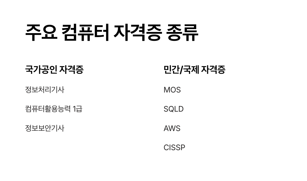 컴퓨터 관련 자격증은 크게 국가공인 자격증과 민간 및 국제 자격증으로 나뉩니다. 각각의 차이점을 이해하고 목적에 맞는 자격증을 선택하는 것이 중요합니다.