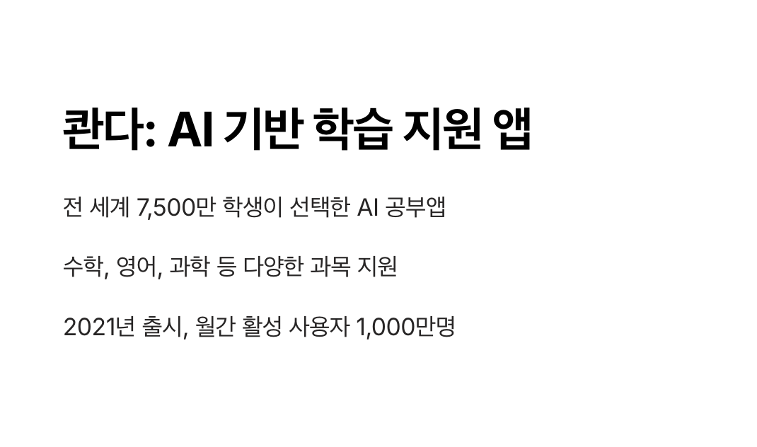 콴다(QANDA)는 학생들이 모르는 문제를 사진으로 찍어 올리면 AI가 자동으로 풀이를 제공하는 학습 지원 앱입니다. 2016년 국내 스타트업인 매스프레소(Mathpresso)가 개발하였으며, 현재는 전 세계 50개국 이상에서 사용되고 있습니다.
