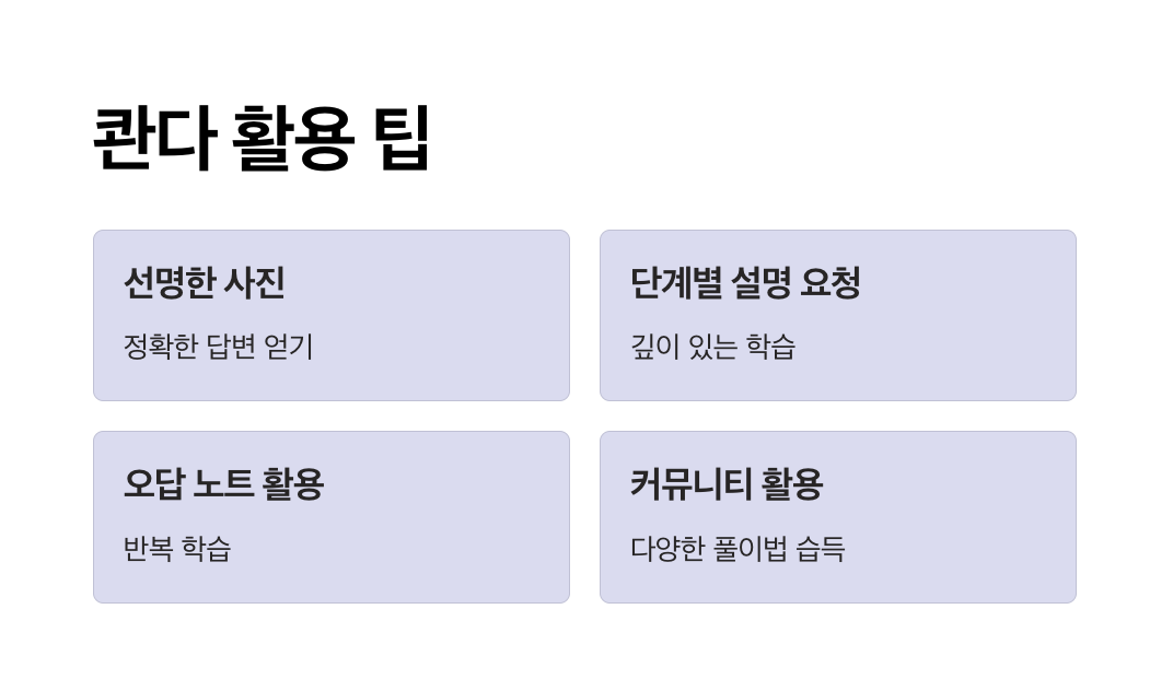 이제 콴다 초보자들도 손쉽게 질문을 올리고 답변을 받을 수 있도록, 이번 글을 활용해 보세요. 콴다 질문 등록, 학습법, 오류 해결 방법까지 익혀 효율적인 학습을 이어가시길 바랍니다.
