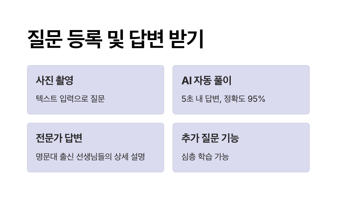 - AI 자동 답변: 몇 초 내로 자동 풀이 및 설명 제공