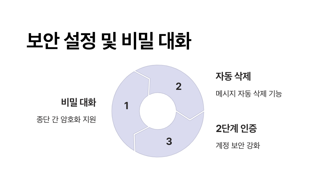 - 비밀 대화는 **종단 간 암호화(End-to-End Encryption)**를 지원해 외부에서 대화 내용을 볼 수 없습니다.