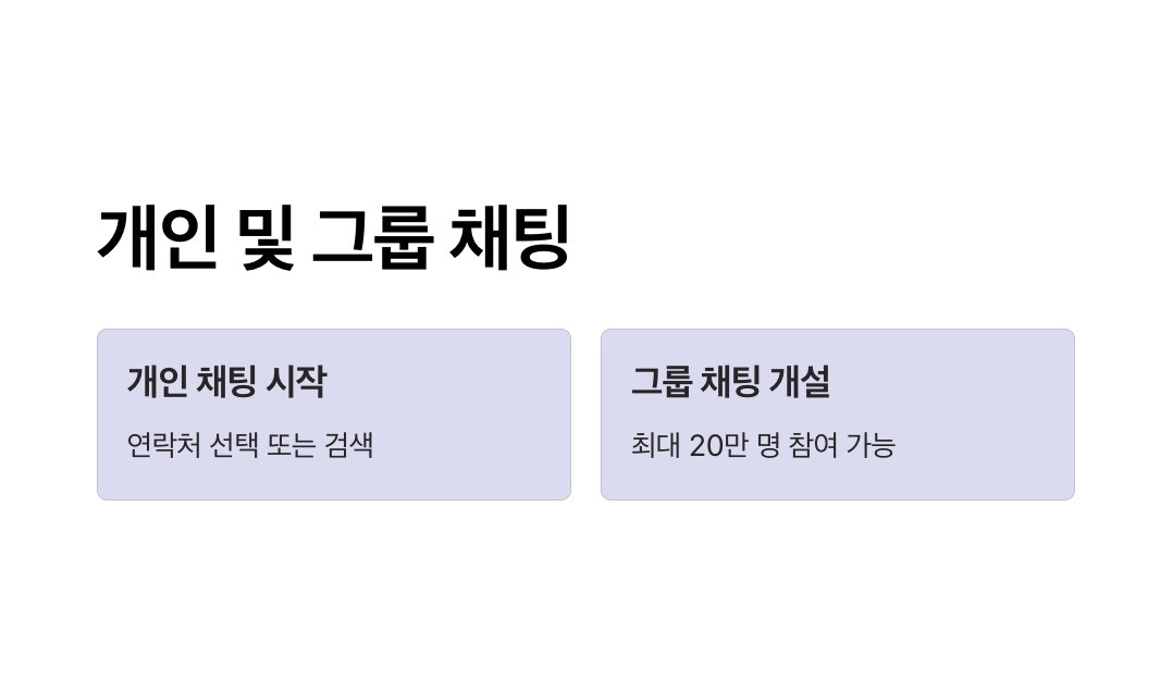 - 그룹 채팅: 그룹 대화는 최대 20만 명까지 참여 가능하며, 대규모 커뮤니티 또는 회사 단위의 소통에서도 효과적입니다.