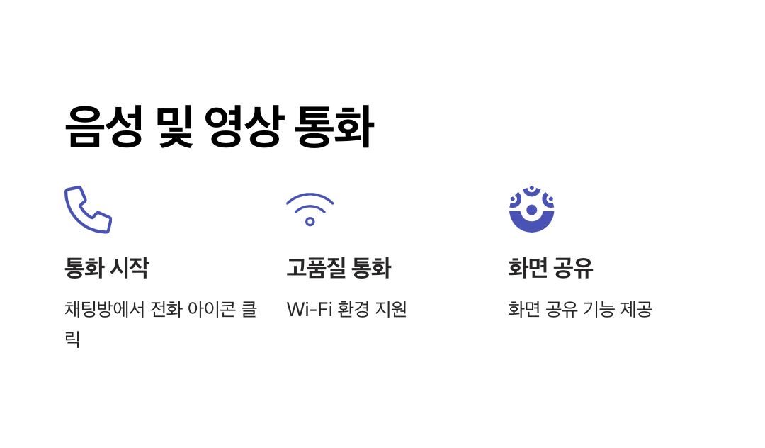 - 채팅방에서 전화기 모양의 아이콘을 누르면 음성 또는 영상 통화를 시작할 수 있습니다.