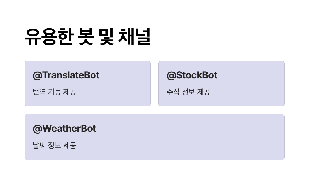 - @TranslateBot: 외국어 번역을 실시간으로 지원하며 해외 사용자와의 소통에 유용합니다.