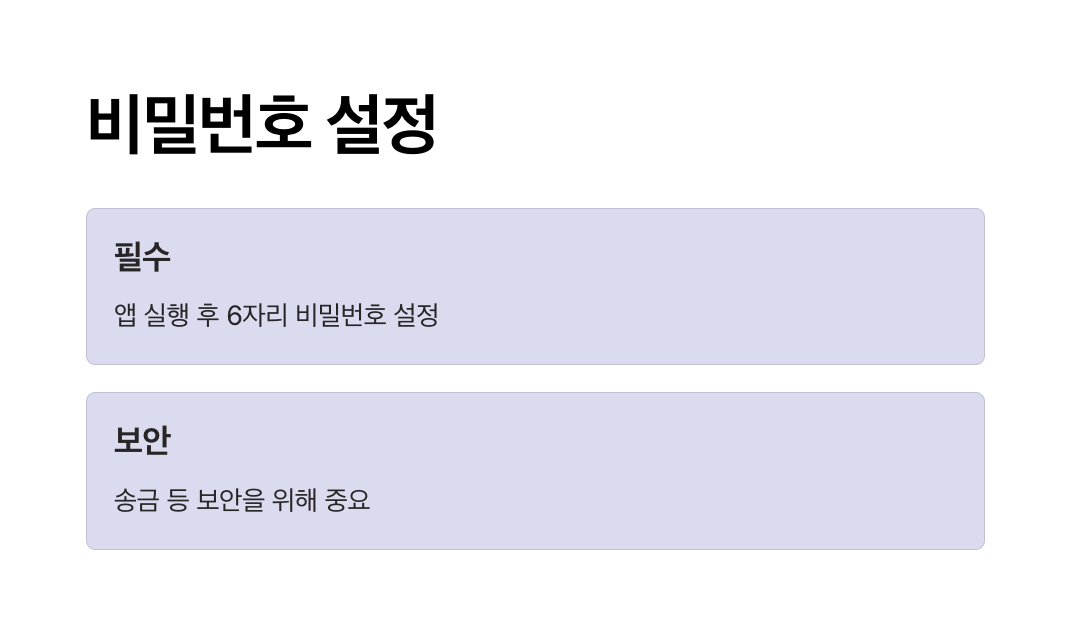 - 설정이 완료되면 비밀번호가 송금, 조회 등의 보안 단계에서 사용됩니다.