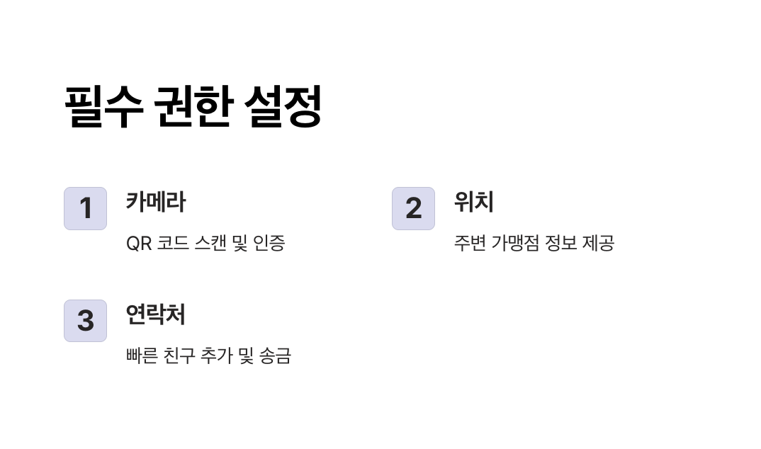 - 카메라: QR코드 송금 및 신분증 촬영 시 필요.