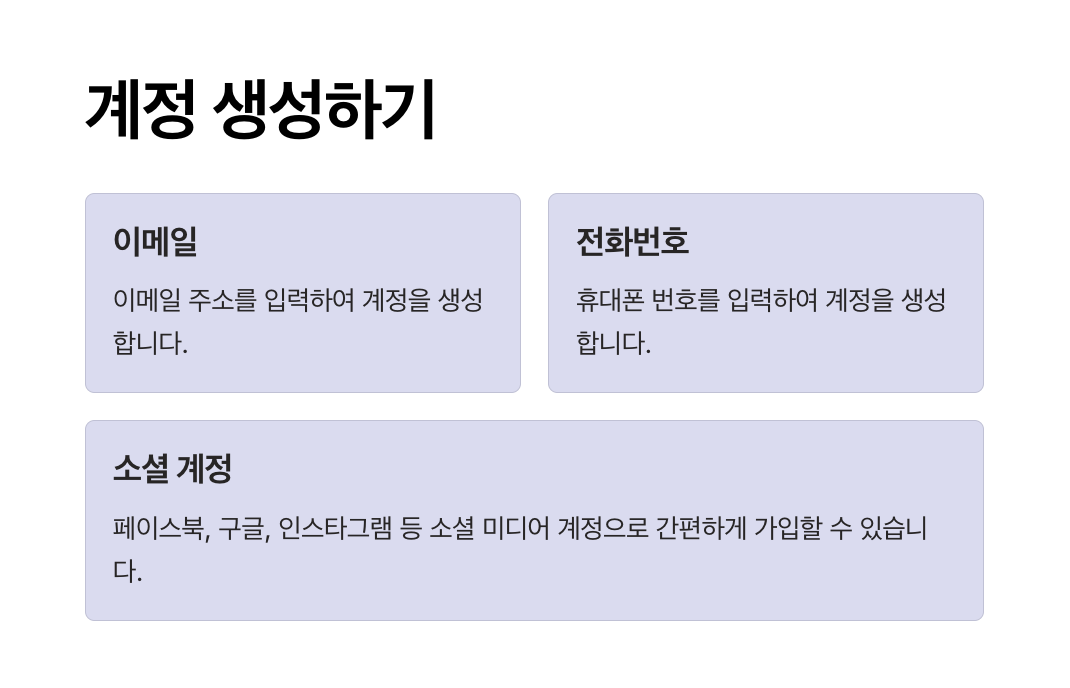 - 가입 옵션 선택: 전화번호, 이메일, Google 계정, Facebook 계정, 또는 Apple 계정을 통해 가입할 수 있습니다.