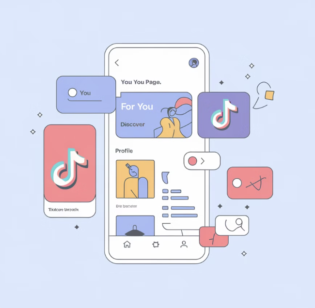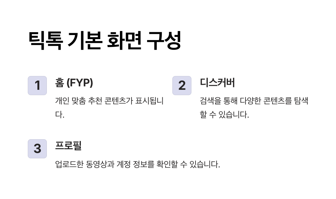 - 홈(FYP): 추천 동영상이 표시되는 메인 화면으로, 개인 맞춤형 알고리즘이 적용됩니다.