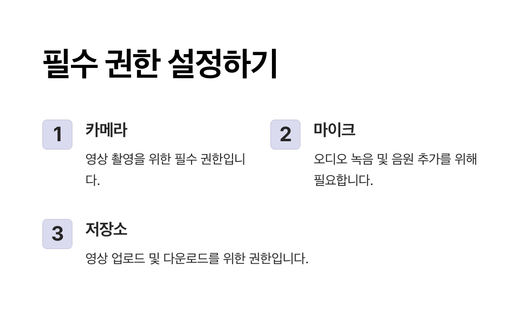 - 카메라 및 마이크 권한: 동영상 촬영과 음성 녹음을 위해 필요합니다.