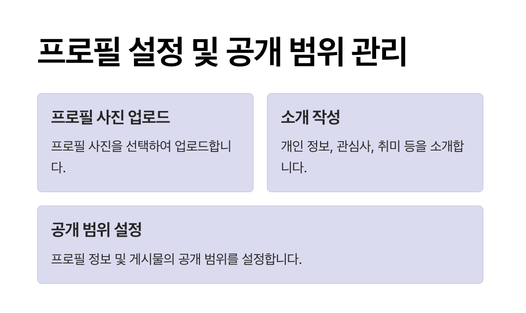 - 공개 범위 설정: 프로필 사진, 게시물, 친구 목록 등을 전체 공개, 친구만, 나만 보기 등으로 설정할 수 있습니다.
