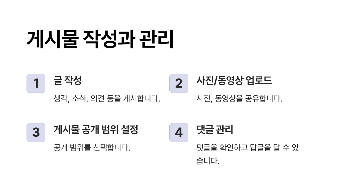 - 게시물을 작성할 때, 공개 범위를 "전체 공개", "친구만", "비공개" 등으로 설정할 수 있습니다.