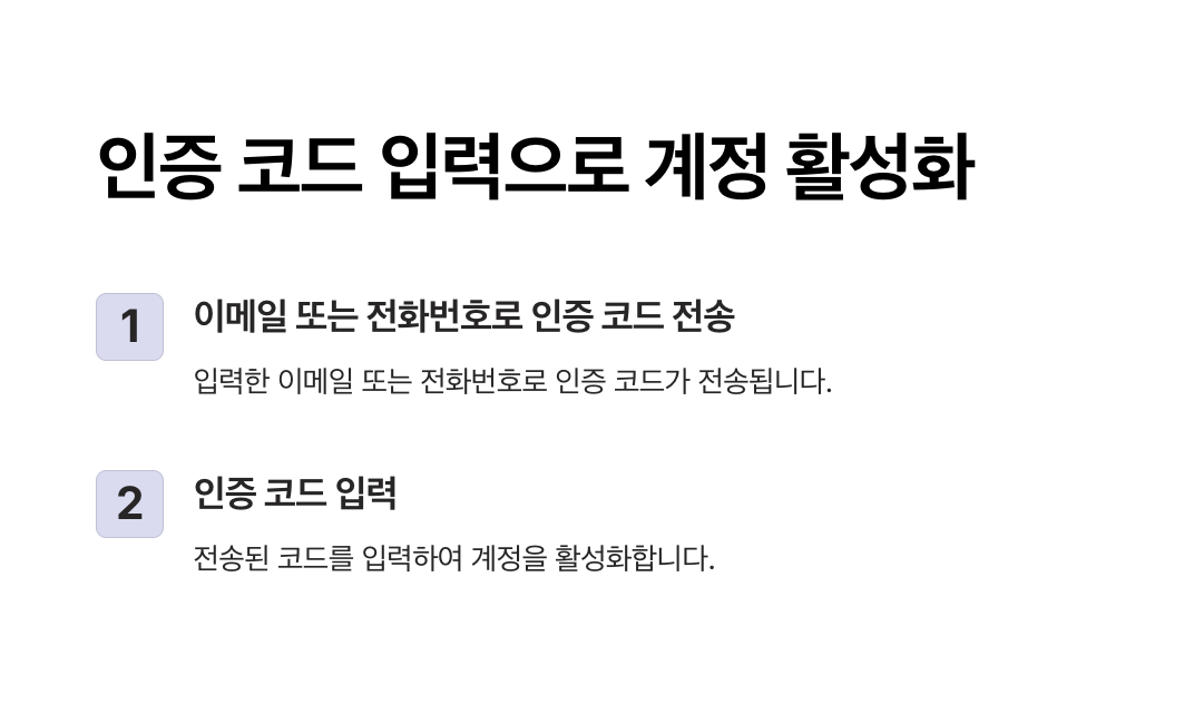 - 입력한 이메일 또는 전화번호로 전송된 인증 코드를 확인한 뒤 입력해 계정을 활성화하세요.
