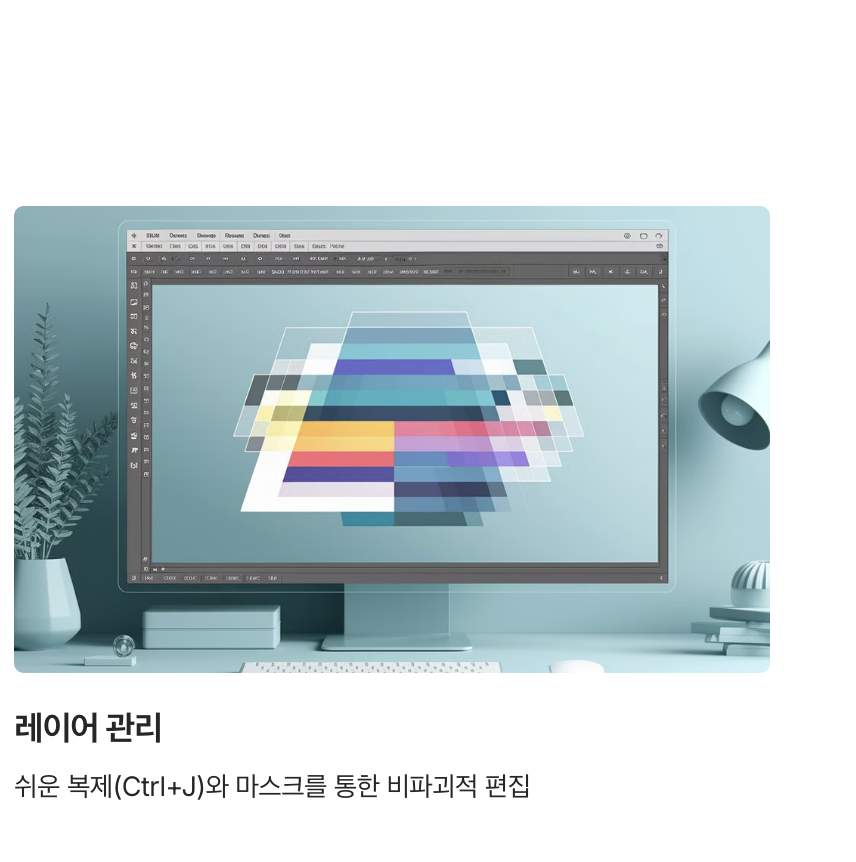 레이어는 포토샵 작업에서 가장 중요한 개념입니다. 각 레이어는 개별적으로 편집할 수 있으며, 비파괴적 작업이 가능합니다.