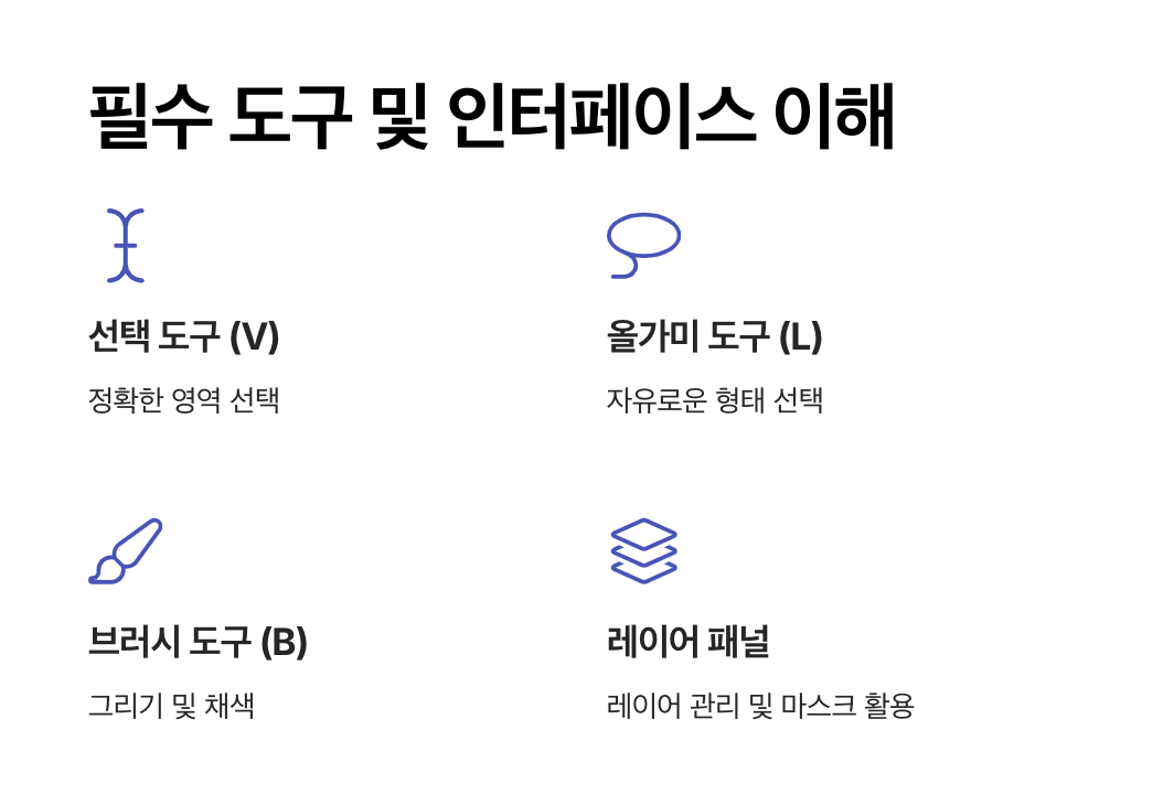 포토샵의 도구와 패널은 다양하지만, 초보자가 가장 먼저 익혀야 할 몇 가지 필수 도구와 인터페이스 구성 요소를 설명하겠습니다.