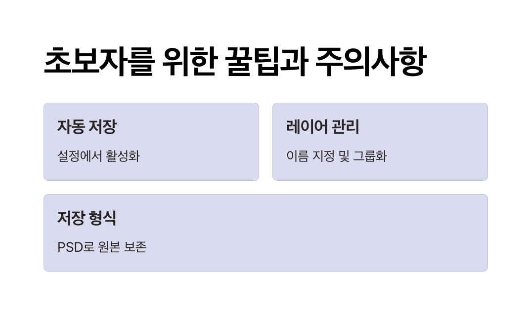 - 레이어 그룹화: 여러 개의 레이어를 선택한 후 Ctrl + G를 눌러 그룹화하여 정리합니다.