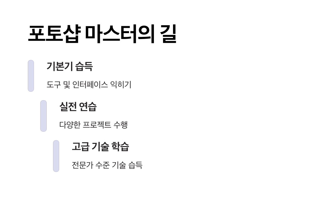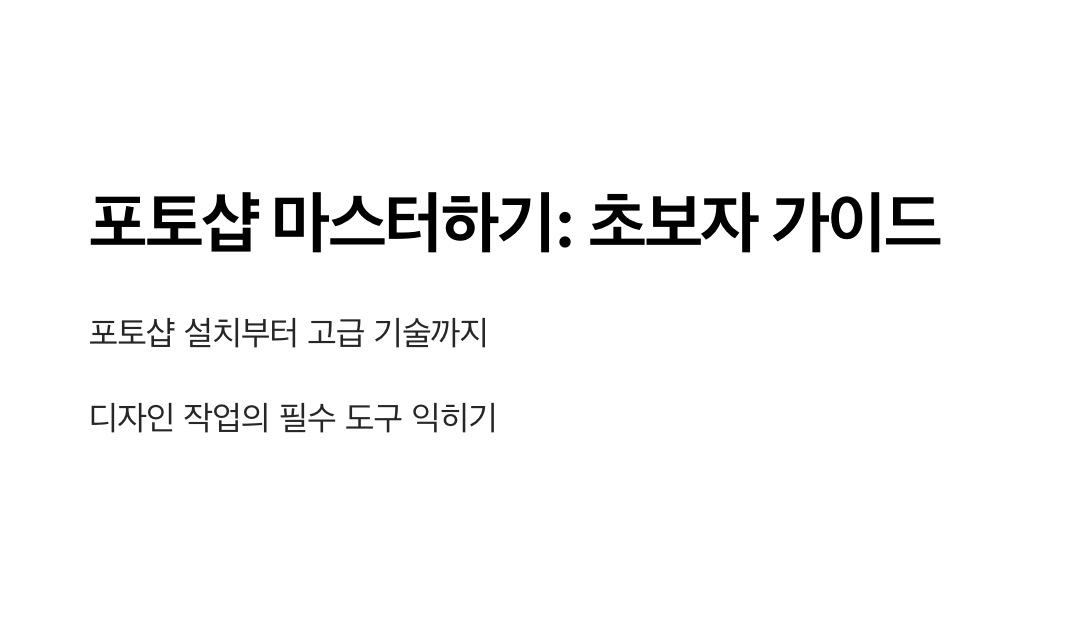 이제 포토샵 기초 강좌를 통해 기초 도구와 설정, 그리고 필수적인 포토샵 기본 단축키까지 알아봤습니다. 포토샵은 다양한 기능을 가진 만큼 처음에는 복잡해 보일 수 있지만, 기초를 정확히 다지면 이후의 과정은 훨씬 수월해집니다. 포토샵 레이어 관리를 포함한 간단한 이미지 편집이나 텍스트 삽입 등 작은 작업부터 도전해 보세요. 한 걸음씩 실력을 쌓는 것이 중요합니다.