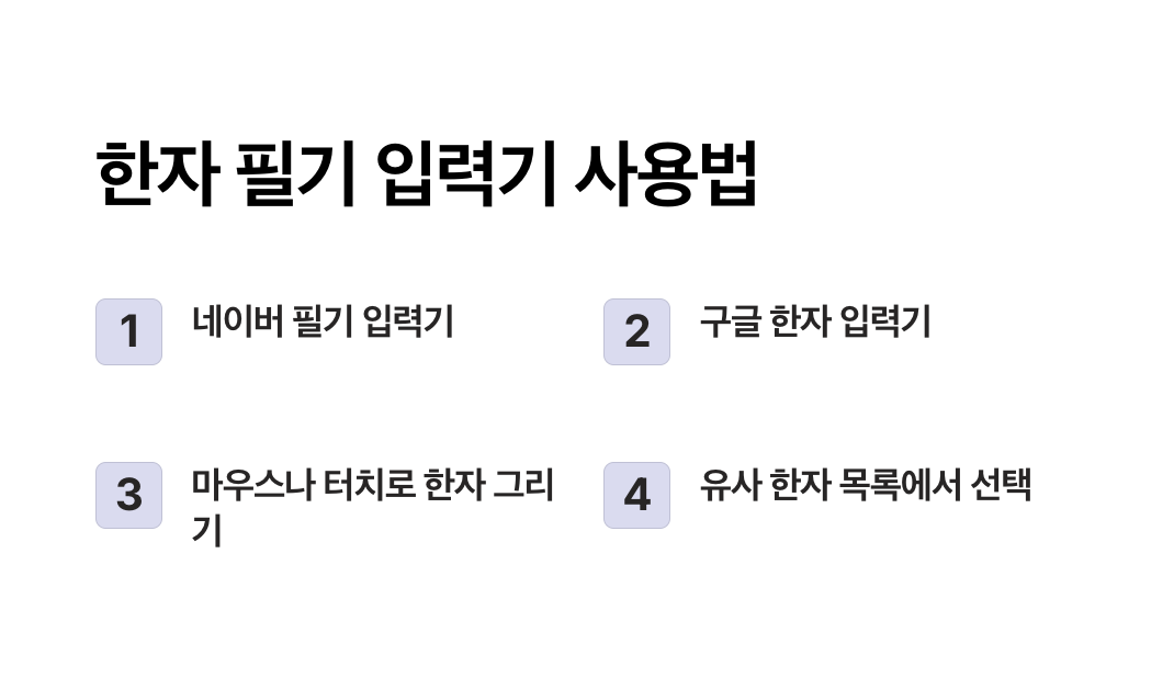 - A3. 필기 입력기가 한자를 정확히 인식하지 못하는 경우, 획을 천천히 또박또박 입력하거나, 다양한 필기 입력기(네이버, 구글 등)를 번갈아 사용하는 것이 도움이 될 수 있습니다. 또한, 획순을 최대한 지켜서 입력하면 인식률이 높아집니다.