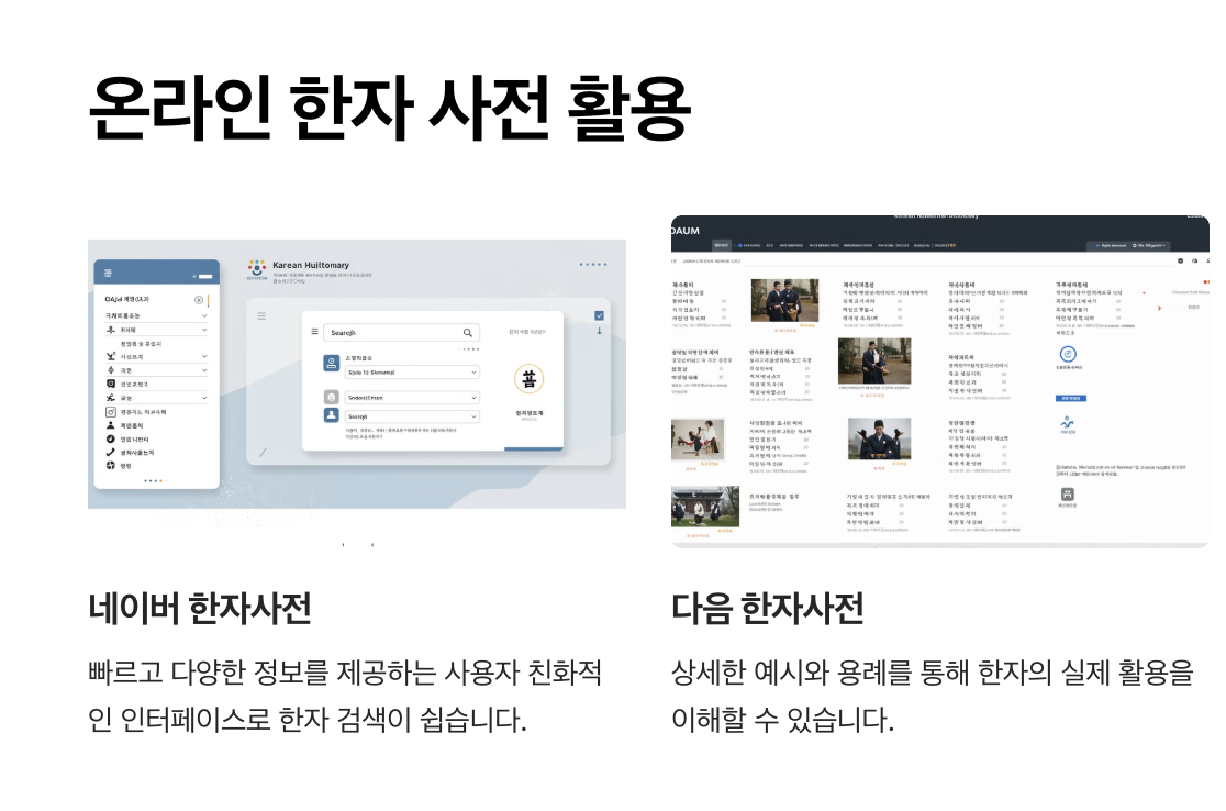 온라인 한자 사전은 가장 빠르고 정확하게 한자의 의미를 찾을 수 있는 방법입니다. 네이버 한자사전, 다음 한자사전, 존 한자사전 등이 대표적인 서비스이며, 한자의 뜻, 발음, 사용 예제까지 상세하게 제공합니다.