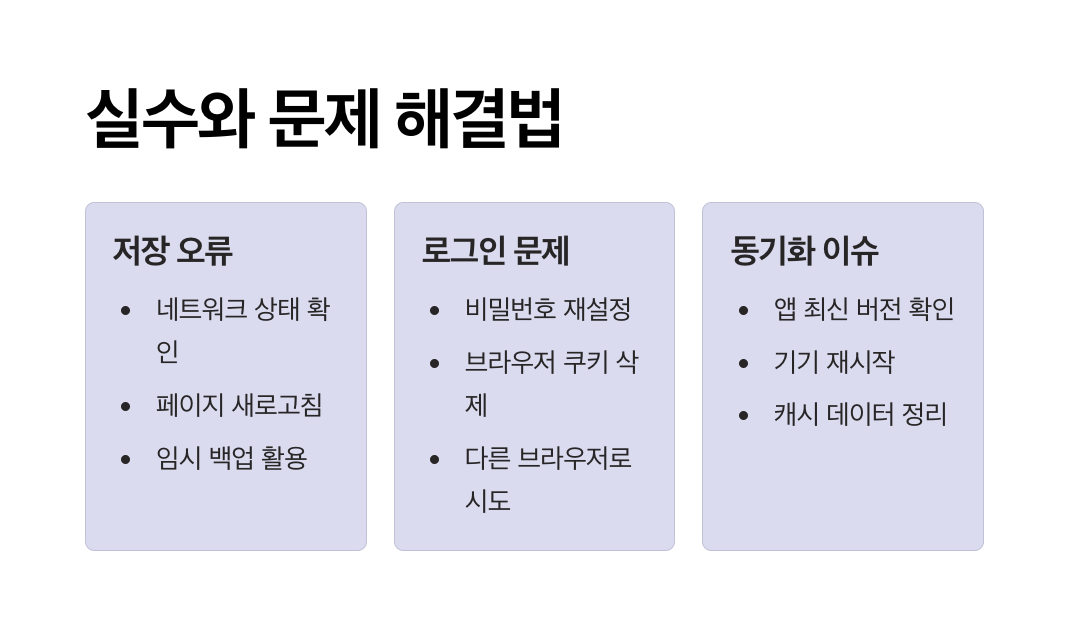 - 문의 시 가입된 이메일 주소와 오류 화면 캡처를 함께 보내면 빠른 도움을 받을 수 있습니다.