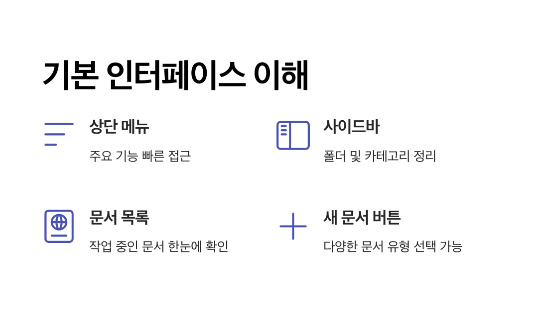 - 왼쪽 사이드바에는 ▶ 새 문서 만들기, 📁 내 문서함, ⭐ 즐겨찾기, 🗑 휴지통 등이 있어 필요한 기능으로 이동하기 편리합니다.