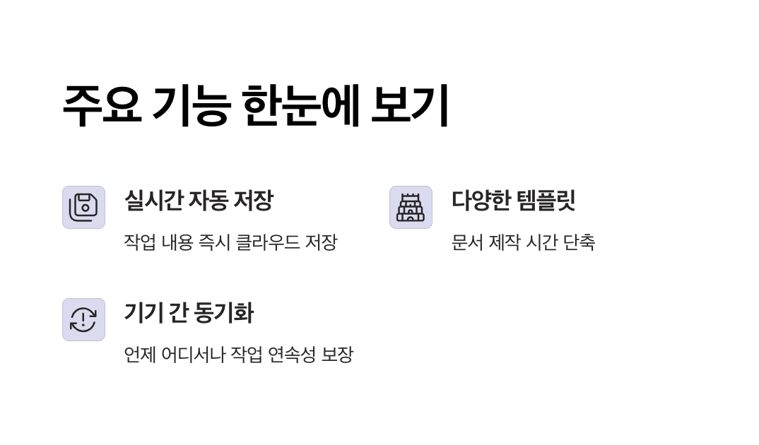 - 문서를 작성하는 즉시 클라우드 서버에 저장되기 때문에, 갑자기 인터넷이 끊기거나 컴퓨터가 꺼져도 내용을 잃지 않습니다.