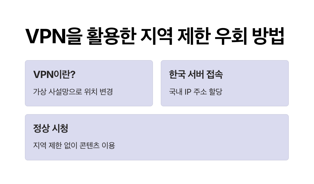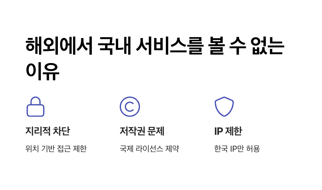 대부분의 국내 스트리밍 서비스는 해외에서 접속 시 “이 서비스는 해당 국가에서 이용할 수 없습니다”라는 메시지를 표시하며 차단됩니다.