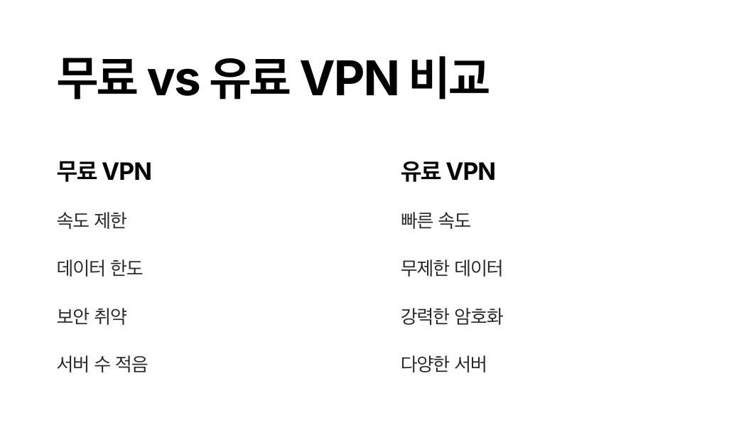| 비교 항목 | 무료 VPN | 유료 VPN |