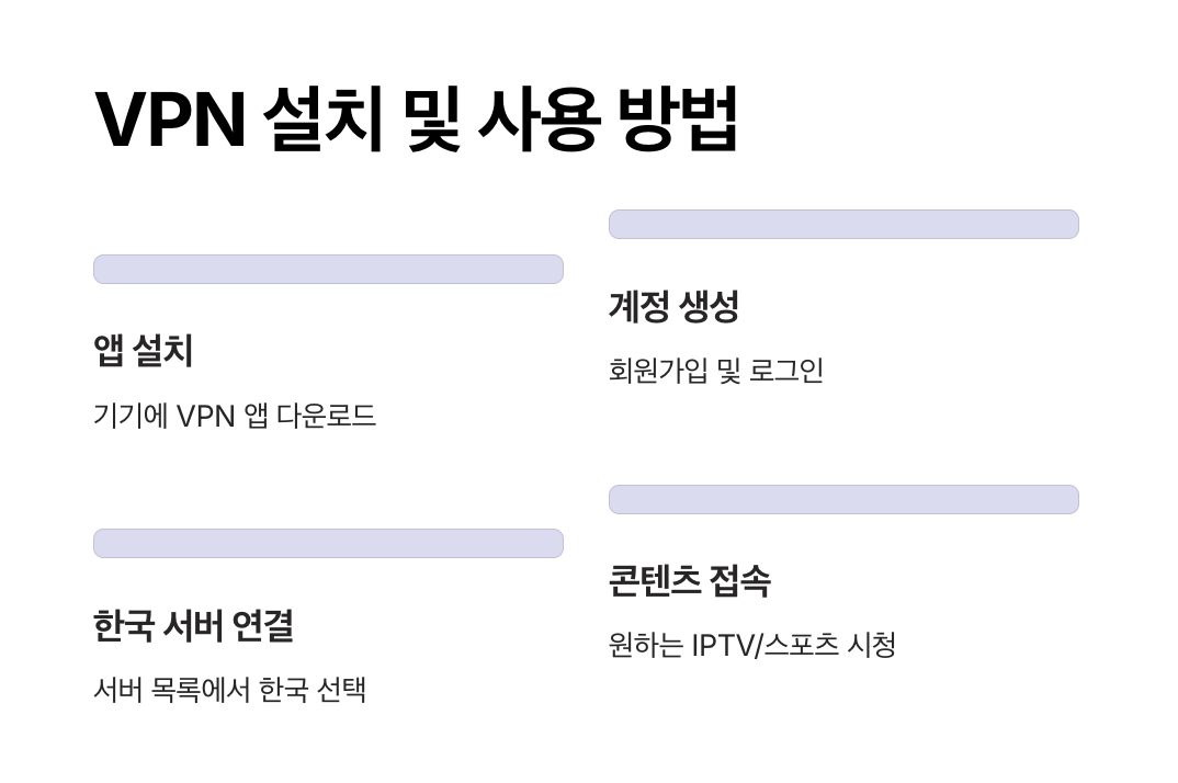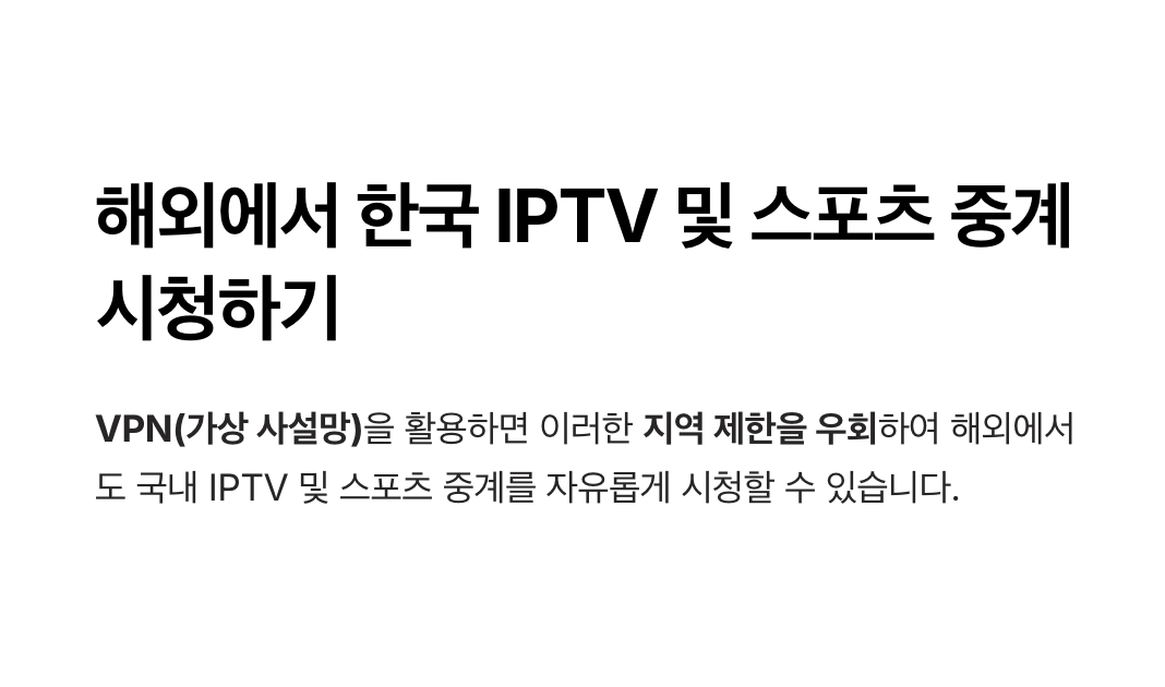 VPN을 사용하면 해외에서도 한국 서버에 연결하여 마치 한국에서 접속하는 것처럼 보이게 되어, 국내 IPTV 및 스포츠 중계를 정상적으로 시청할 수 있습니다.