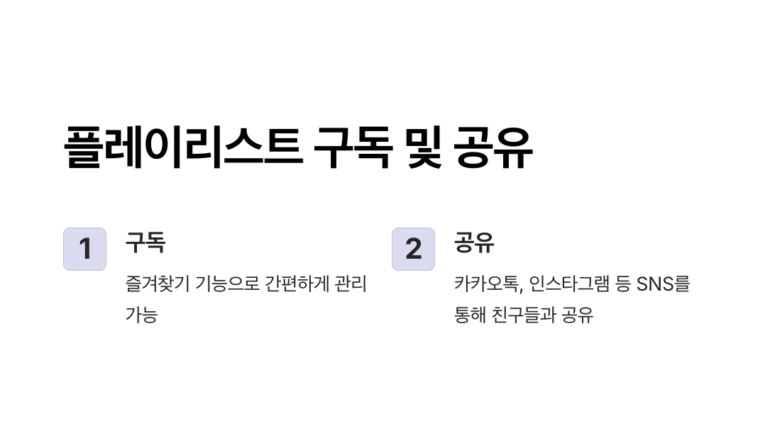 - 플레이리스트 하단의 "공유" 버튼을 클릭하면 카카오톡, 인스타그램, 페이스북 등 SNS로 바로 공유 가능합니다.