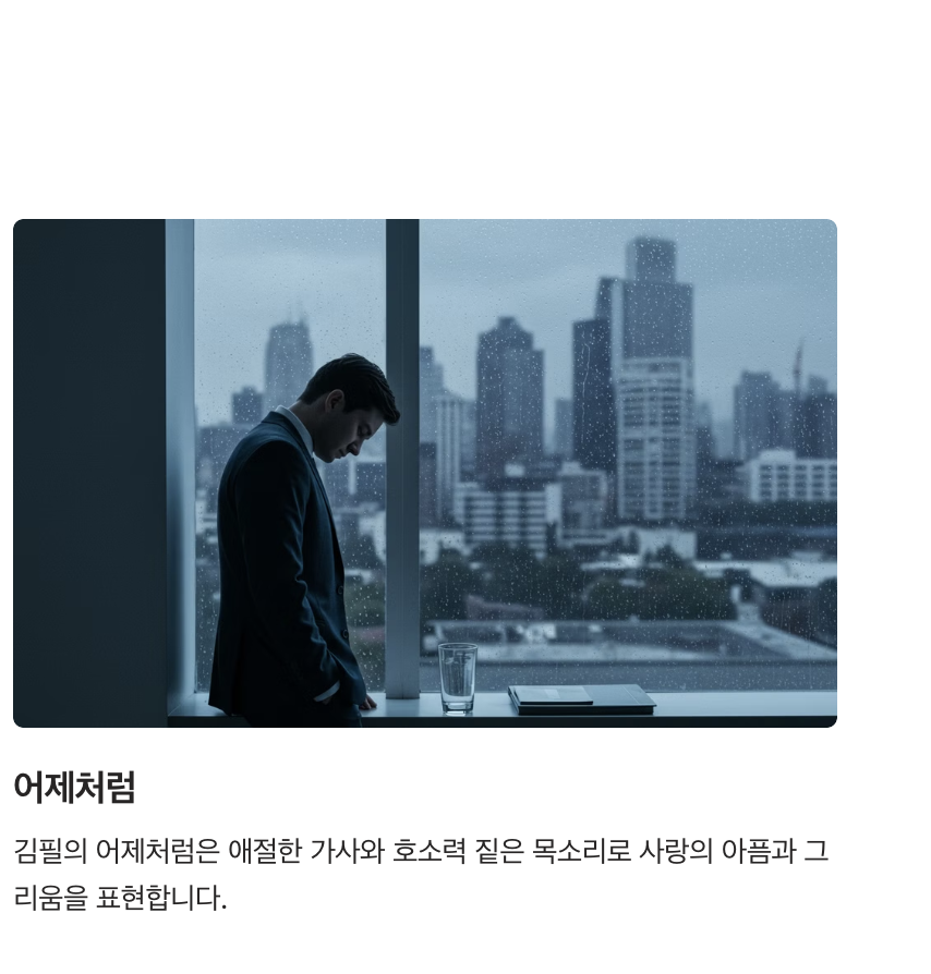 - 김필 - "어제처럼": 호소력 짙은 보컬과 감정이 깊게 묻어나는 곡.