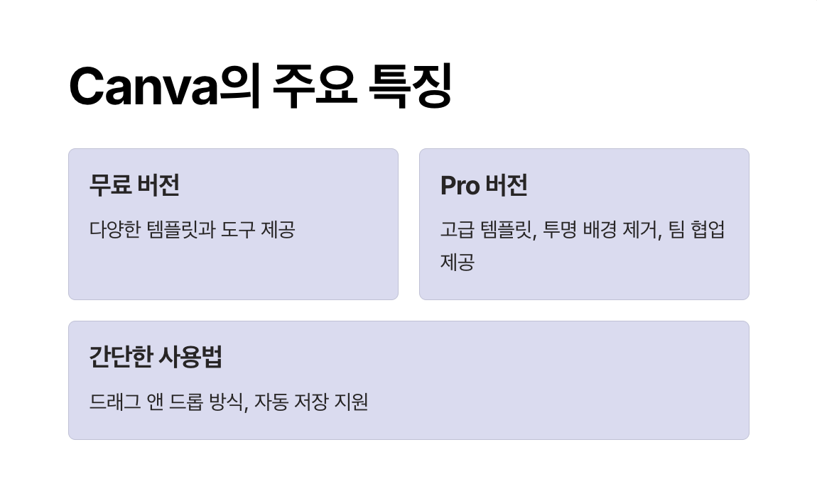 - Pro 버전: 추가적으로 고급 템플릿, 투명 배경 제거, 팀 협업 등의 기능 제공.
