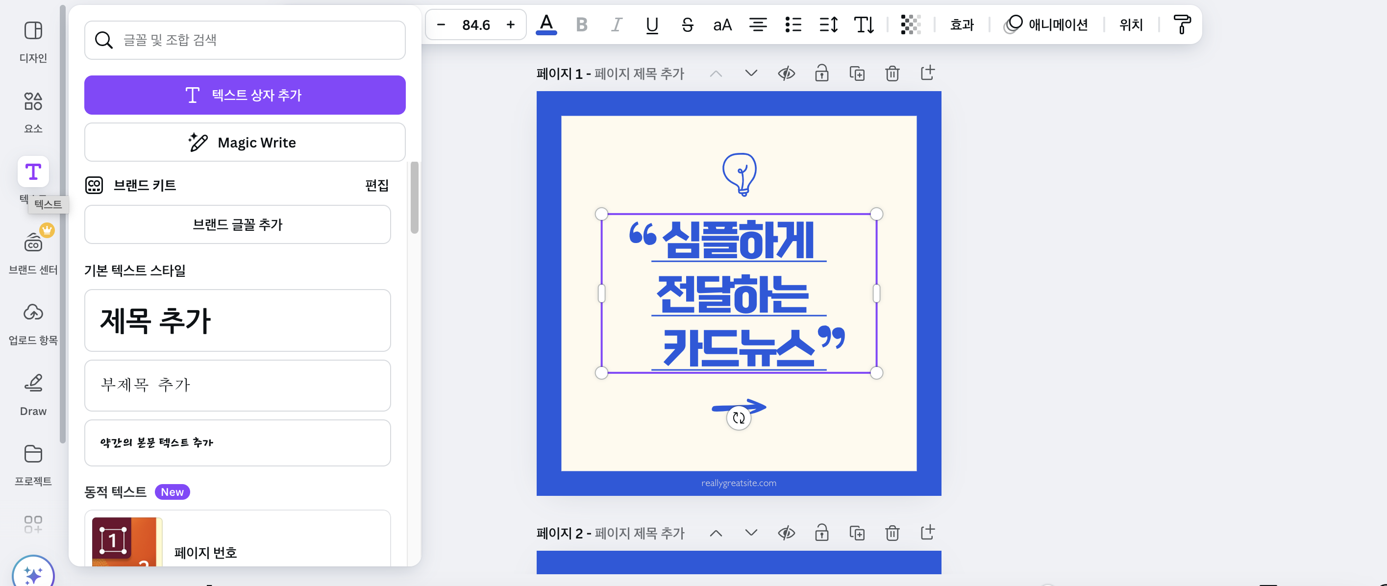 - 텍스트 수정: 템플릿에 포함된 텍스트를 클릭해 내용을 수정하세요. 예를 들어, "제목" 부분에 원하는 문구를 입력합니다.