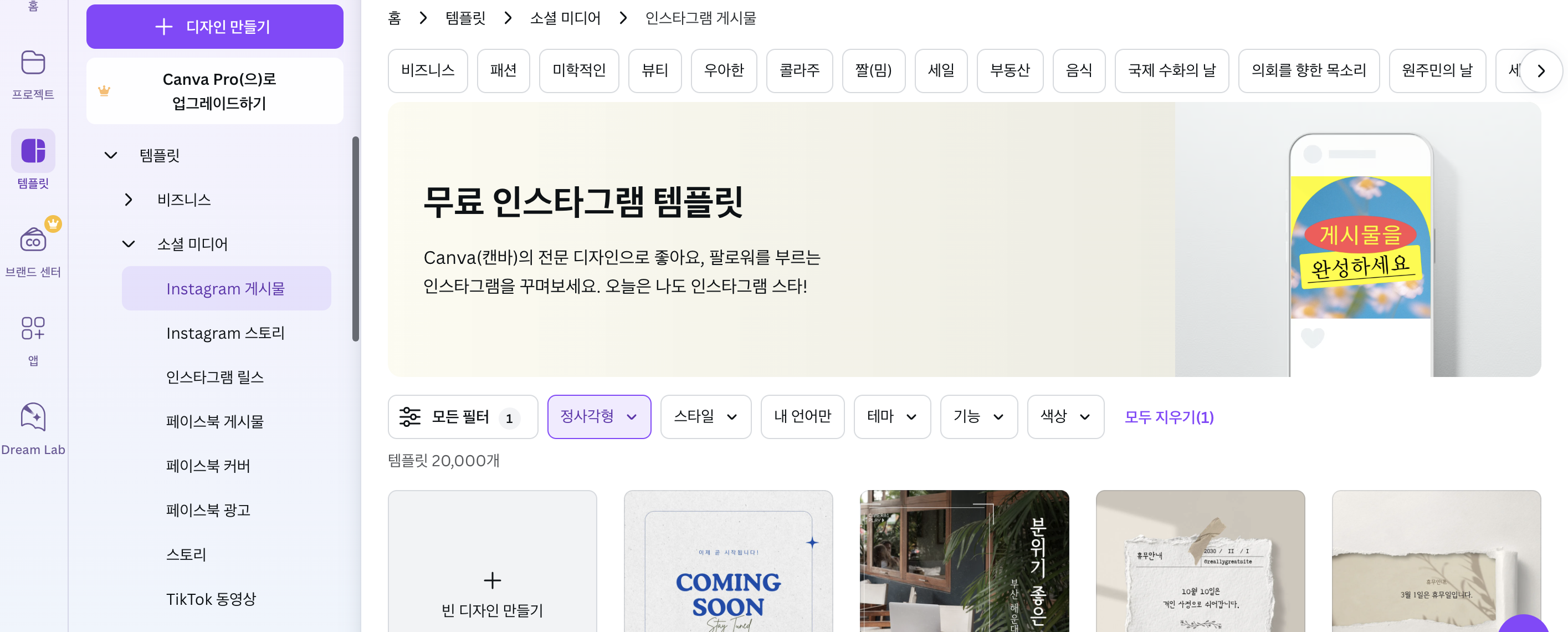 - 카테고리별 템플릿: 소셜 미디어, 인포그래픽, 명함, 포스터 등 원하는 카테고리를 선택하세요.