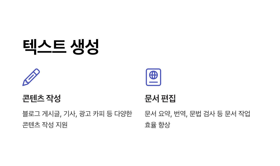 - 콘텐츠 생성: 블로그 글, 기사, 광고 문구, 소셜 미디어 콘텐츠 등 다양한 유형의 글 작성 가능.