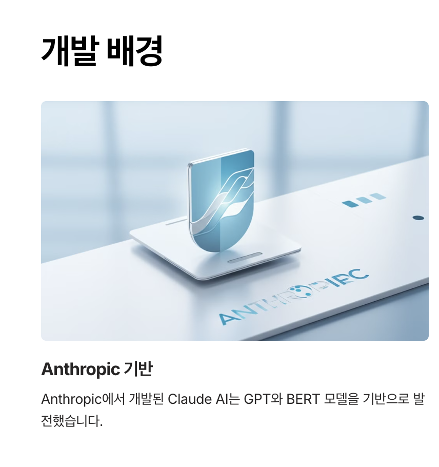 Claude AI는 AI 기술의 선도주자인 Anthropic에서 출시한 모델입니다. Anthropic은 AI 기술의 안전성과 사용자 편의성을 최우선으로 삼으며, 최신 AI 기술을 활용해 Claude AI를 설계했습니다. Claude AI는 OpenAI의 GPT 시리즈와 Google의 BERT 모델에서 영감을 받아 개발되었으며, 기존 모델의 한계를 극복하기 위해 강력한 학습 알고리즘과 직관적인 인터페이스를 결합한 것이 특징입니다.
