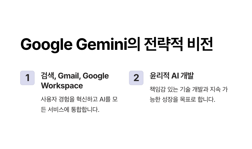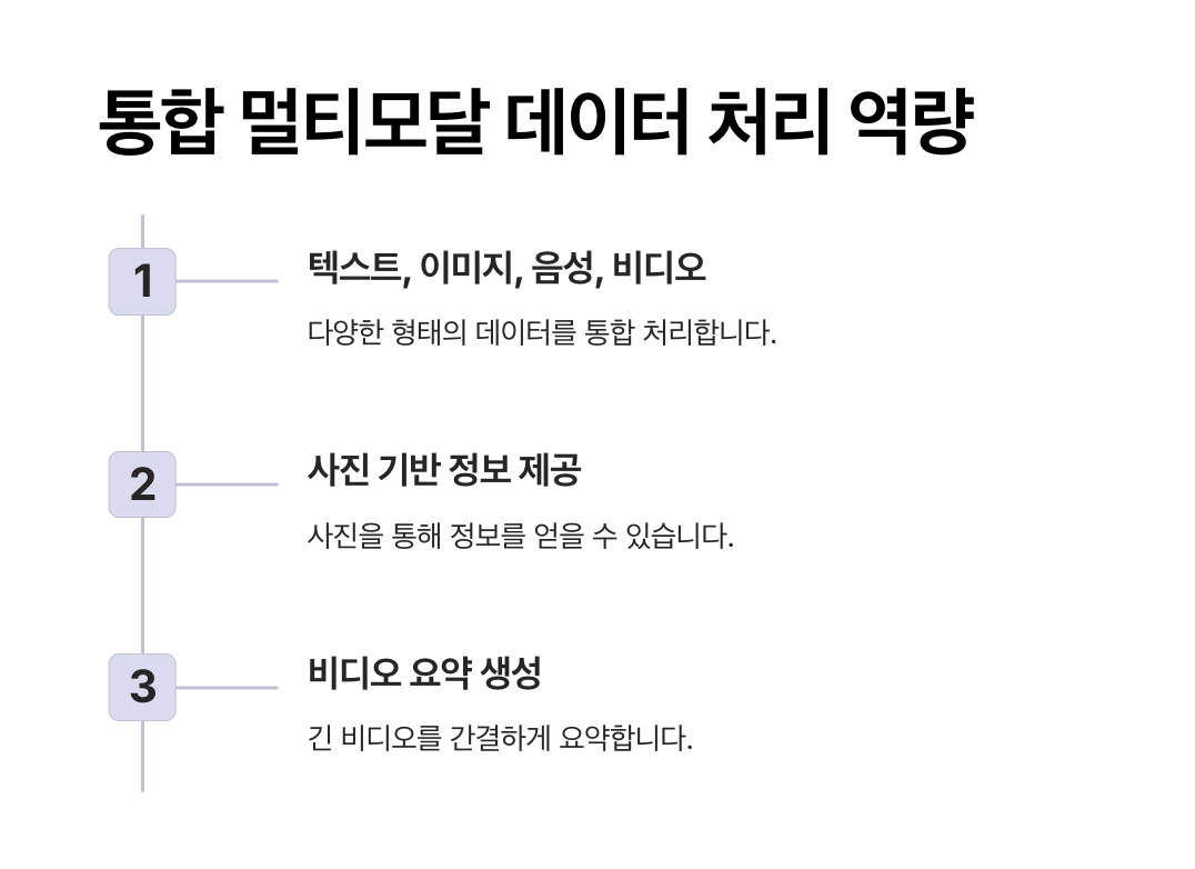 Google은 Gemini를 통해 이러한 멀티모달 처리 능력을 극대화하여, 단순히 명령을 수행하는 AI에서 나아가 사용자의 요구를 예측하고 통합적으로 지원하는 AI를 목표로 하고 있습니다.