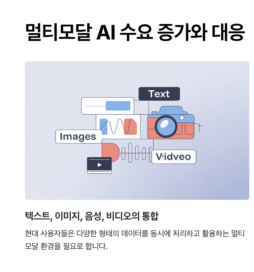 기존 텍스트 기반의 AI 모델은 인간과의 상호작용에서 한계가 있었지만, 멀티모달(Multimodal) AI 기술은 텍스트, 이미지, 음성 등 다양한 데이터를 처리하여 훨씬 더 직관적이고 포괄적인 사용자 경험을 제공합니다.
