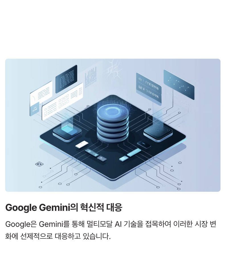 이러한 상황에서 Google은 AI 시장에서의 주도권을 되찾기 위해 Gemini를 전략적으로 개발했습니다. Gemini는 Google의 방대한 데이터와 고급 AI 기술을 결합하여, 단순히 경쟁자를 따라가는 것이 아니라 기술적 차별화를 이루는 것을 목표로 합니다.