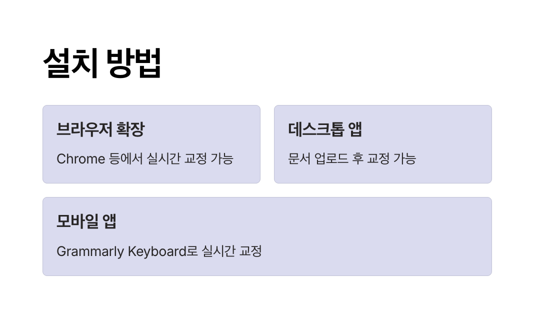 Grammarly는 다양한 플랫폼에서 사용할 수 있습니다. 아래는 주요 설치 방법입니다: