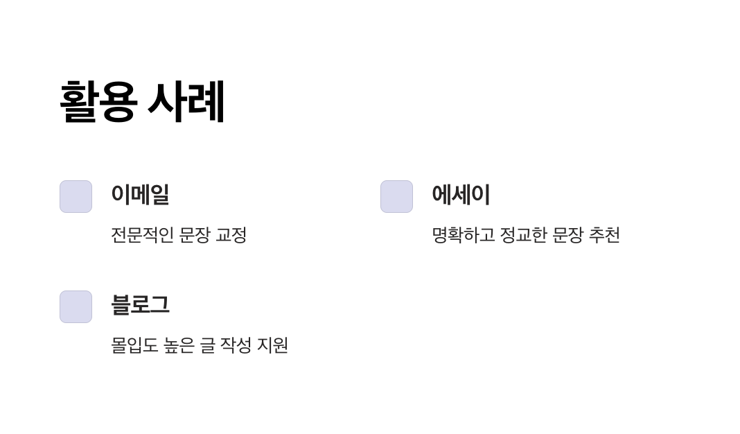 - 맞춤 피드백: 글의 목적(예: 비즈니스, 학술, 창의적 글쓰기)에 따라 교정 스타일을 맞춤 제공.