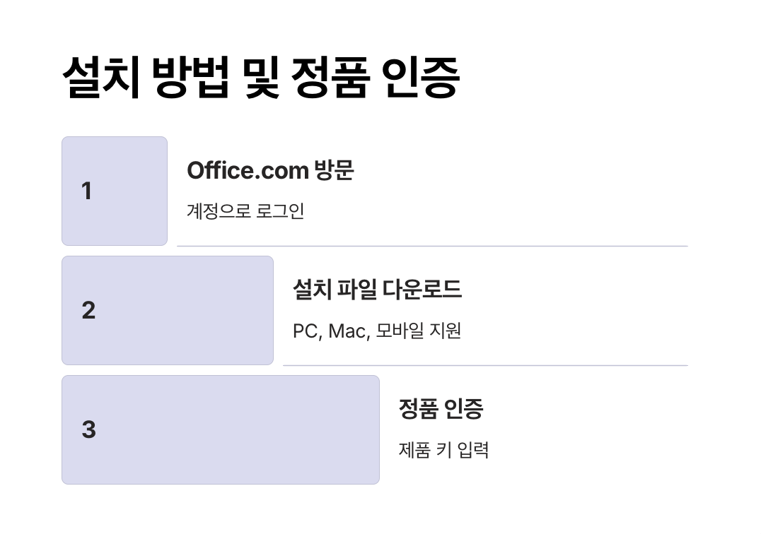 | 1. MS 오피스 설치 및 다운로드 | MS 오피스 최신 버전의 설치 파일 다운로드와 계정 로그인을 지원하는 공식 웹사이트입니다. 구독 및 라이선스 정보도 확인할 수 있습니다. |