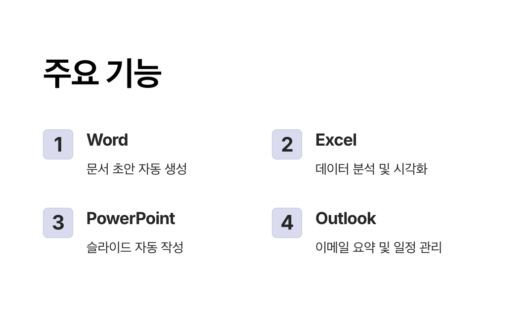 - 창의적 작업 지원: PowerPoint에서 프레젠테이션 생성, Word에서 문서 작성 등 창의적 업무를 빠르고 효율적으로 수행.