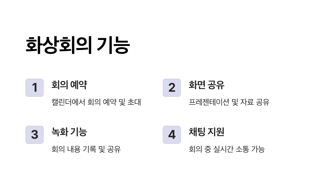 - "캘린더" 탭에서 회의 일정을 예약하고 초대 링크를 생성하세요.