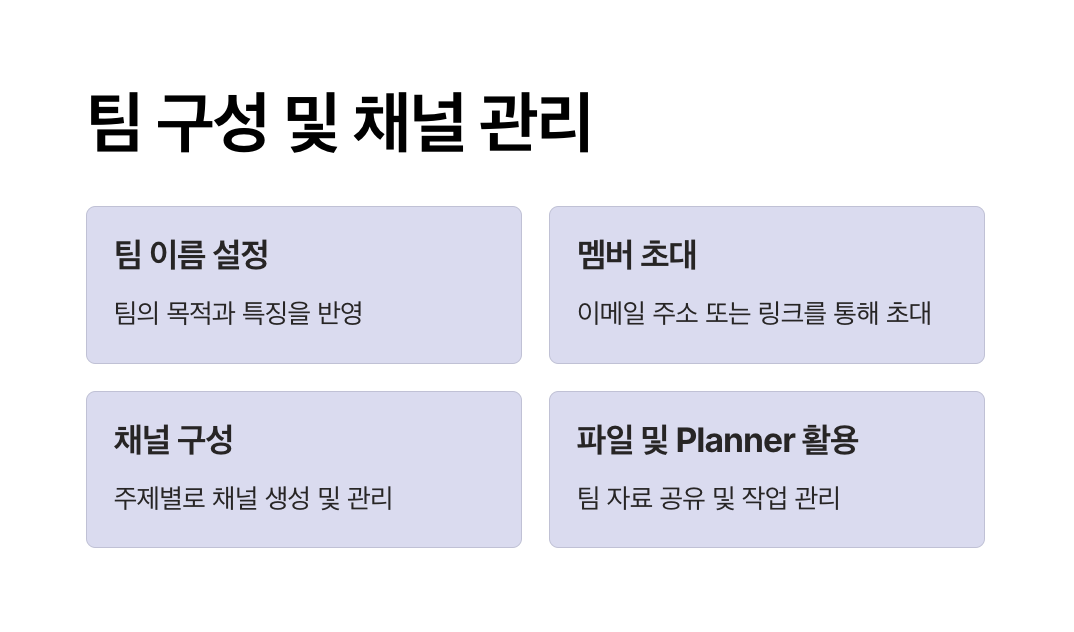 - 팀 내부에서 채널을 만들어 주제별로 대화를 정리하세요.