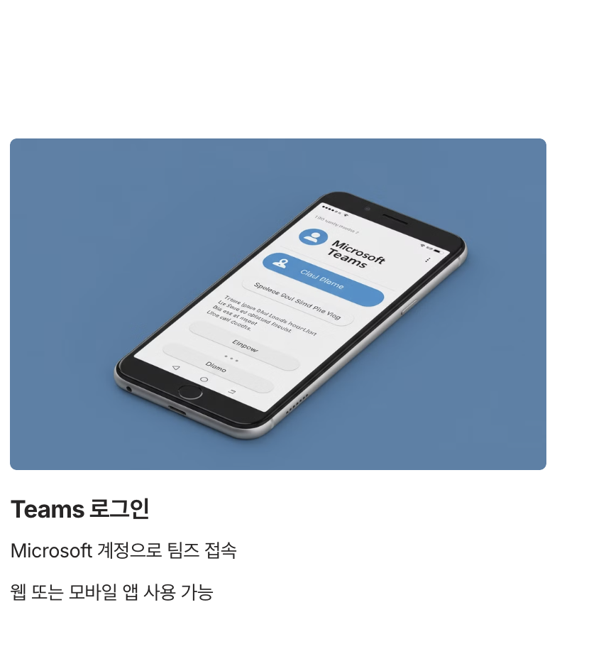 - A5. 네, 팀즈는 모바일 앱(Android/iOS)으로도 사용할 수 있습니다. 모든 주요 기능이 모바일에서도 제공되며, 이동 중에도 편리하게 이용 가능합니다.